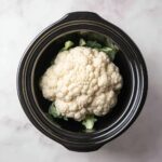 Start by removing the large outer leaves from your cauliflower to reveal the clean head beneath. Trim the stem just enough so the cauliflower sits flat and stable in your slow cooker—this foundation is key for even cooking.